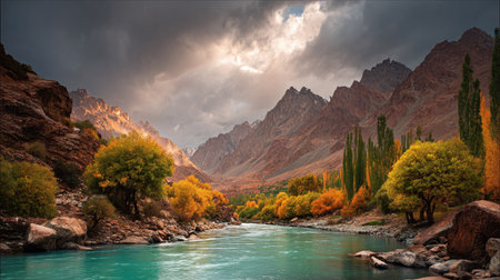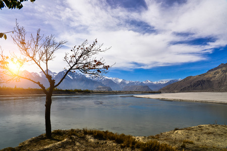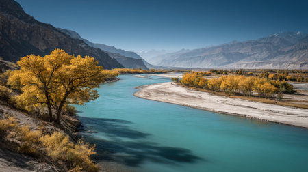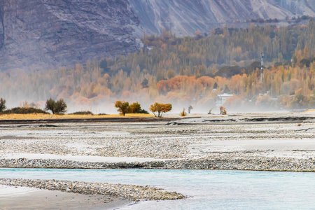 Scenic Shyok river landscape with colorful foliage between the Karakoram Ranges in Gilgit-Baltistan in Pakistan.