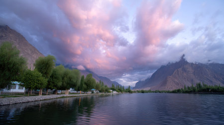 A breathtaking view of a tranquil lake surrounded by majestic mountains, highlighted by vibrant clouds at dusk creating a serene and picturesque atmosphere.