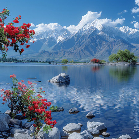 Breathtaking view of a calm lake surrounded by towering snow-capped mountains and blue skies. Fluffy clouds reflect on the waters surface.
