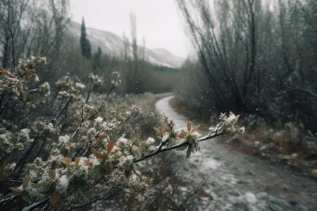 Sudden and unexpected cold snap in early spring, cold climate, spoiled weather, snow wind, early cold, morning frost, empty cities and streets, snow-covered landscapes, gloomy desolation.