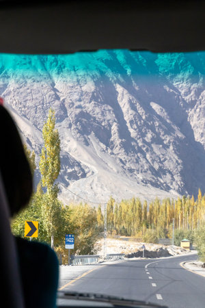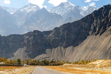 Majestic mountain road under bright sky with colorful autumn leaves in Gilgit-Baltistan in Pakistan.
