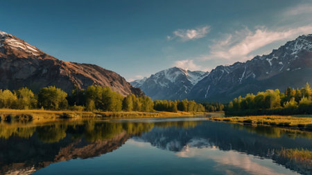 This stunning image captures a tranquil lake reflecting majestic snow-capped mountains, framed by vibrant greenery and a bright blue sky, perfect for nature lovers.