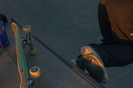Closeup of teenager having break in a skate park on summer day outdoors side view Skater with skateboard sitting and chilling at urban area