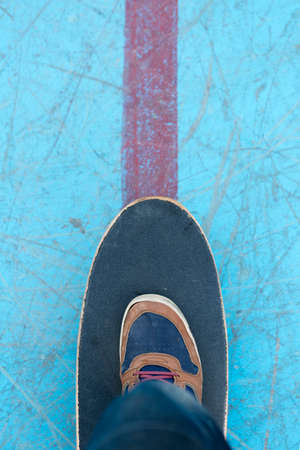 top view of a foot of a skater on a skateboard - focus on the shoe