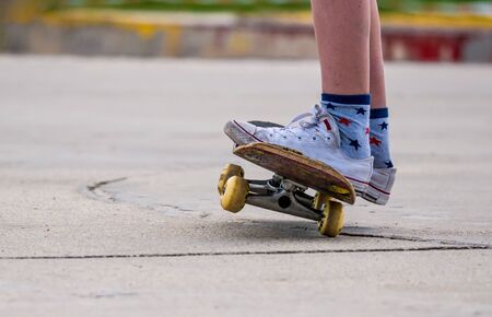 Skateboard stunt training. Skateboard and children's feet in sneakers against wall background. Healthy lifestyle concept. Shallow depth of field. Selective focus.