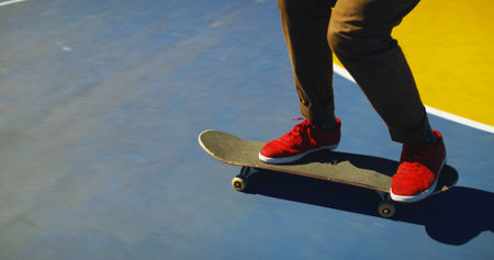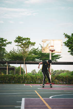 Kuala Lumpur, Malaysia - July 1, 2020: Skateboarding at the basketball court. Active teenager lifestyle.