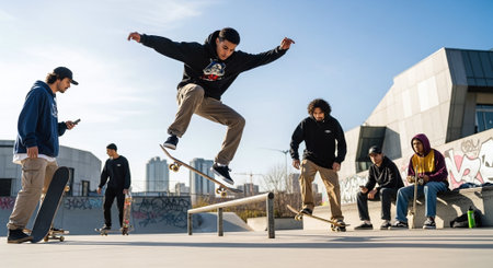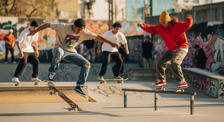 A youthful summer skateboarding session unfolds at a beachside skate park, with teenagers showcasing their skills, vibrant graffiti adorning ramps, casual summer fashion, all set in an active and stylish urban scene