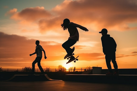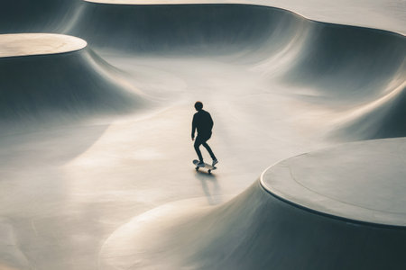 Silhouetted young man skateboarding in an empty concrete skatepark, capturing the essence of freedom and adventure during sunset