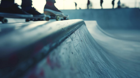 A detailed shot of a steep ramp with a group of skaters using it to practice their vert tricks