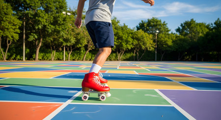 A low-angle shot of a person's legs wearing bright red retro roller skates on a colorful, multi-colored outdoor skating rink. The person is skating in a park on a sunny day, representing fun, leisure, and an active retro hobby.