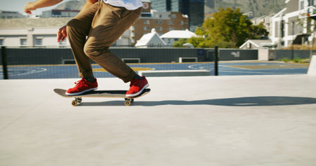 Skateboard, legs and person training for trick for outdoor hobby, activity or challenge at park. Sports, gen z and feet of skater with sneakers for skating with skills learning for competition.