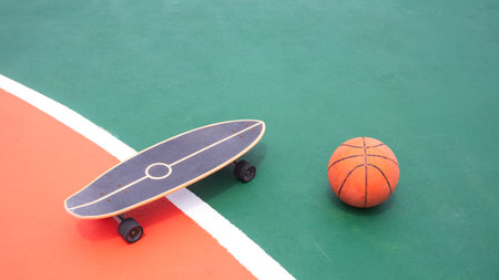 Skateboard and basketball on colorful outdoor basketball court, High angle view with copy space