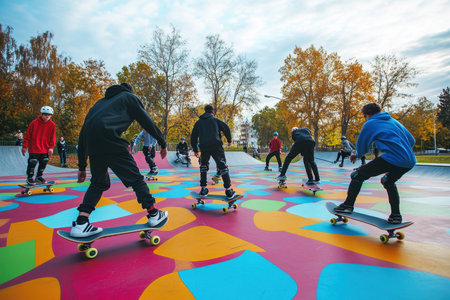 Groups of young skateboarders showcase their skills in a colorful park under autumn trees.