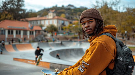 Young Black man with dreadlocks, wearing a brown knit beanie and a textured mustard hoodie with a graphic. He has a black backpack and a skateboard.