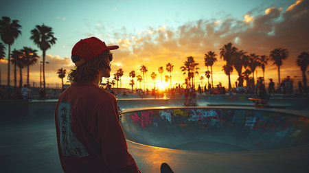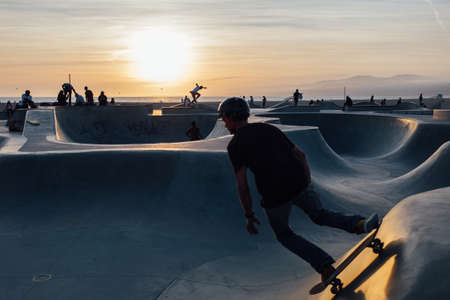 Skateboarder at sunset Venice Skateboard Park in Venice Beach, CA United States