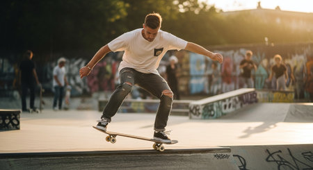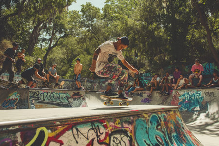 Urban skateboarding adventure in vibrant skatepark with action-packed tricks