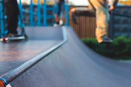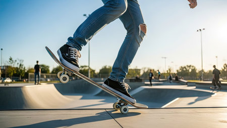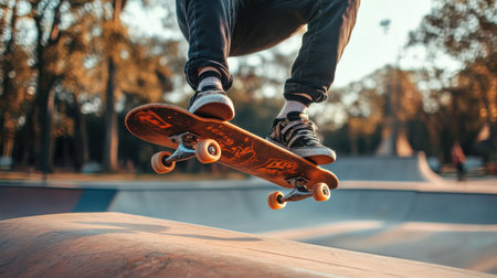Skateboard at an empty skate park during sunrise. Concept of skateboarding, sport, outdoor activity, urban lifestyle.