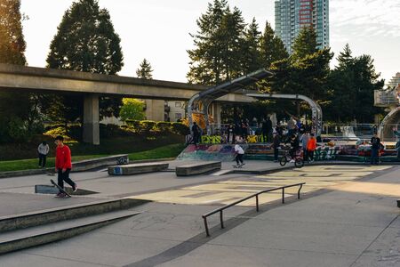Vancouver, canada - december, 2019 Skaters and bikers having fun practicing at sunset.