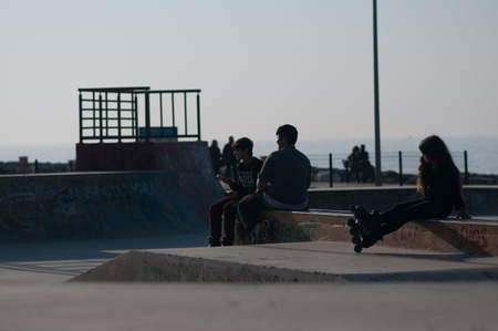 girl on roller skates resting sitting the city of Iskenderun, Turkey - January 20, 2017