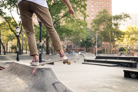 Young adult skating outdoors - Stylish skater boy training in a nNew York skate park, concepts about sport and ifestyle