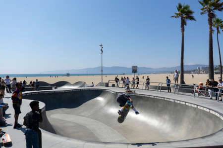 A skateboarder in action at Venice Beach Skate Park in Los Angeles, California, USA