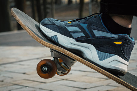 closeup of feet of young man with skateboard