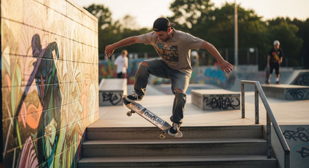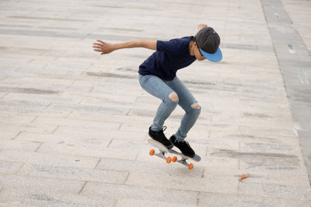 Young adult skating outdoors in the city. Stylish skateboarder training in skate park. Concept of skateboarding as sport and lifestyle.