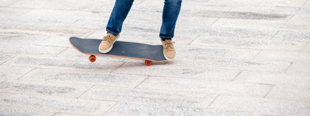 Man legs with skateboard on asphalt. Background image with copy space for text.