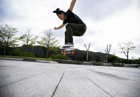 Asian woman skateboarder skateboarding in modern city