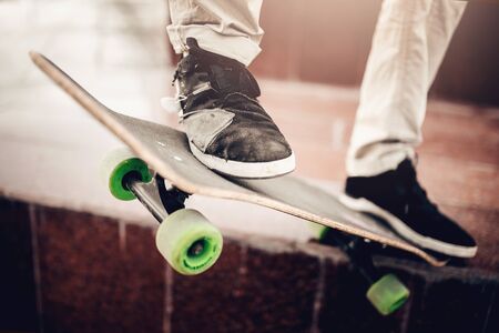 Skateboard stunt training. Skateboard and children's feet in sneakers against wall background. Healthy lifestyle concept. Shallow depth of field. Selective focus.