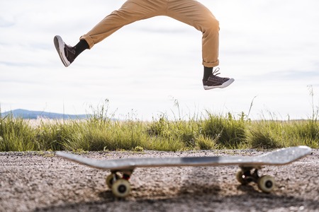 do stunts on the longgord while riding on a board on the asphalt. Closeup of your skateboard leg.