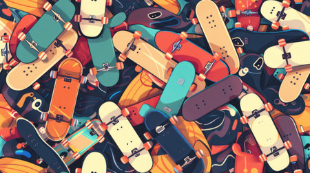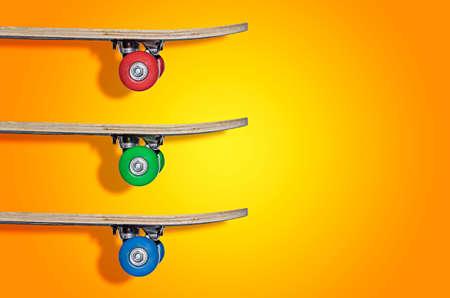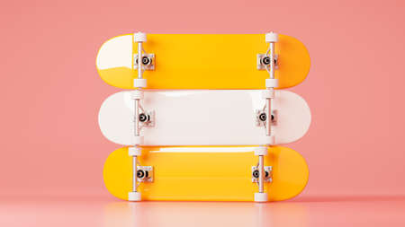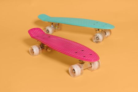 Two skateboards with gradient color schemes are positioned on a vibrant background. The objects are rendered in a clean, modern style, possibly a digital illustration. The lighting is soft, creating a smooth and appealing visual effect. Suitable for various design projects and commercial applications.