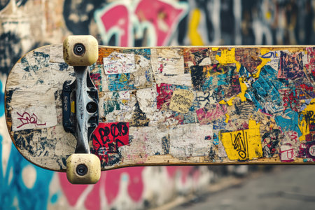 Skateboard covered in worn-out vintage stickers and graffiti leaned against a textured wall, showcasing a blend of urban art and history in a lively location