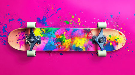 A striking skateboard features bright splashes of color against a lively pink background, capturing the spirit of urban sport and artistic expression.