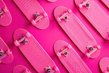 Many pink skateboards lined up on bright pink background, flat lay with copy space for text or design concept