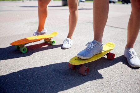 Children's feet in sneakers close-up on a skateboard on Pavement. Physical development of children.