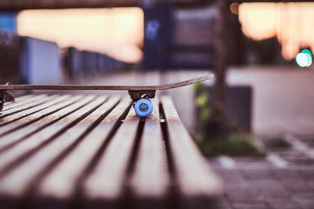 Close-up photo of a skateboard that standing on a bench on the embankment during a beautiful sunset.