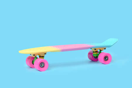 Cruiser board on a classic blue background. youth entertainment. top view.