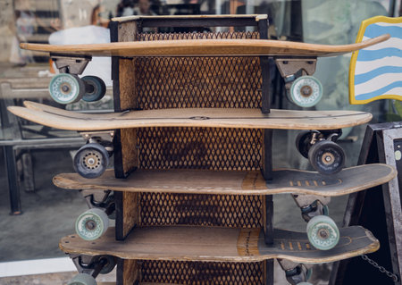 Many surfskate hanging on the skateboard shop wall. many vibrant colors.