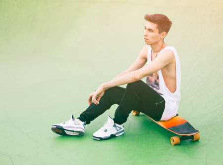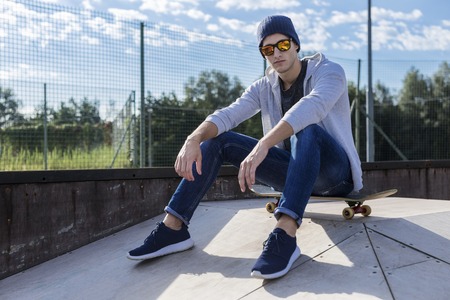 Fashionable young man sitting on a longboard in the ramp for skateboarding in the summer