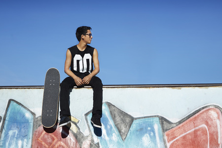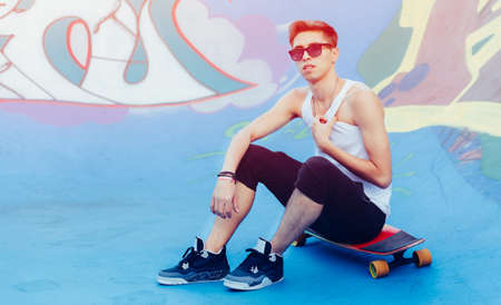 Fashionable young man sitting on a longboard in the ramp for skateboarding in the summer. A skateboarder wearing white sunglasses, shirt, shorts and sneakers. graffiti in the background. Outdoor.