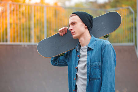 Young skatebarder posing with skateboard in the skatepark. Sport concept.
