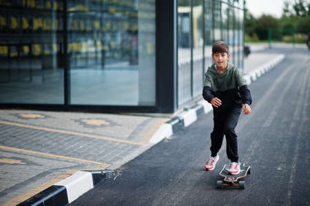 A carefree modern teenage boy in stylish youth clothes and sunglasses is longboarding on the street. Activity, summer and youth lifestyle.