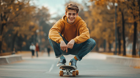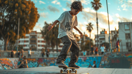 Energetic teenage skateboarder performing a trick in a vibrant urban park.
