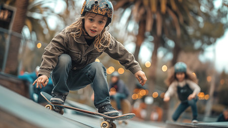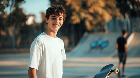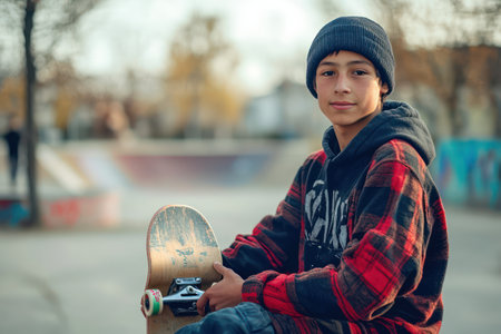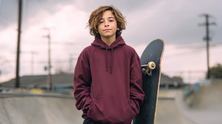 A young boy stands confidently at a skate park with his skateboard, embodying the thrill of youth and urban culture, ready to take on new adventures and challenges.