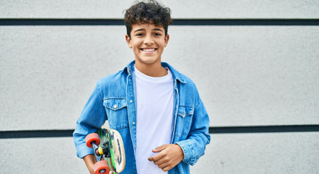 Boy with skateboard stands confidently against a textured wall, wearing denim jacket and white t-shirt, radiating joy and enthusiasm for skateboarding, AI generated