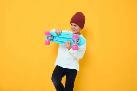 Cool smiling boy in a red hat skateboard in his hands isolated background