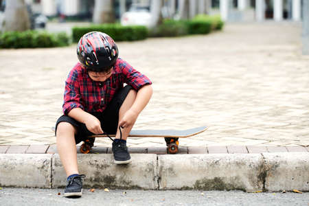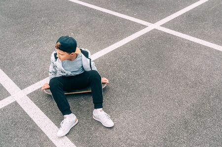 Teenager skateboarder boy with a skateboard sitting on asphalt playground and resting after he made tricks.