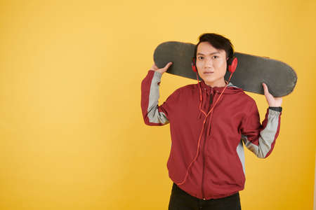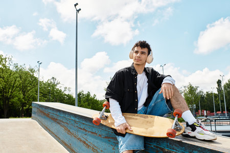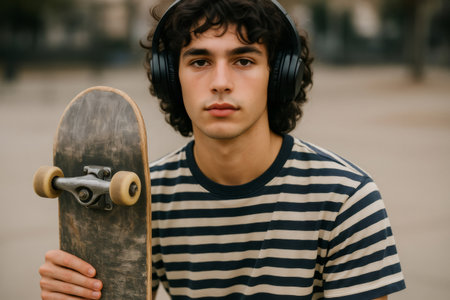 Portrait of a confident young man wearing headphones and holding a skateboard, enjoying music while embracing an urban lifestyle