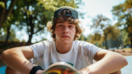 A young man, wearing casual clothing, is seated on a skateboard in a park. He appears relaxed, with trees and greenery in the background. The skateboard is colorful and shows signs of use. The park setting suggests a casual and recreational atmosphere.